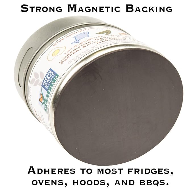 - MAGNETIC TINS: Each and every tin has a unique magnetic base that sticks to most metal surfaces: your fridge, BBQs, hood, range, and oven. Keep your artisanal seasoning within easy arm’s reach, and transform simple plates into chef-driven gourmet dishes.