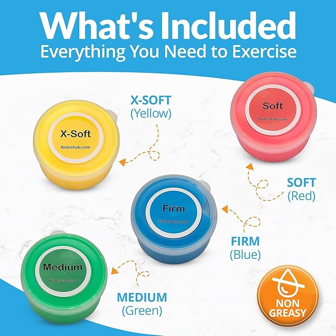 - 4 Resistance Levels for Hand Therapy - Our therapy putty kit includes four color-coded firmness levels: Yellow (X-soft), Red (Soft), Green (Medium), and Blue (Firm) that come in individual containers & support progressive hand rehab. These primary colors offer endless fun with tailored strength.