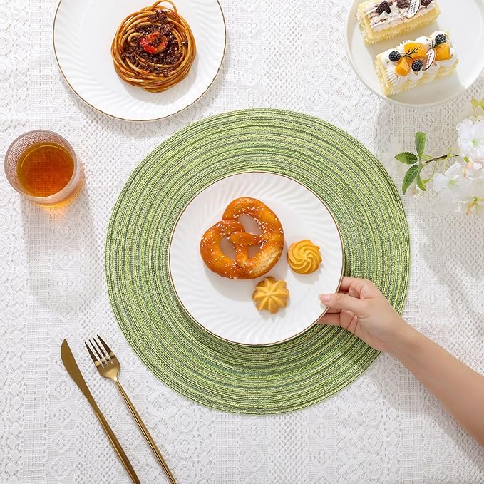 SHACOS Round Placemats Set of 6 for Dining Tables 15 inch Cotton Braided Placemats Washable Reversible for Kitchen Holiday Party (Pea Green, 6)