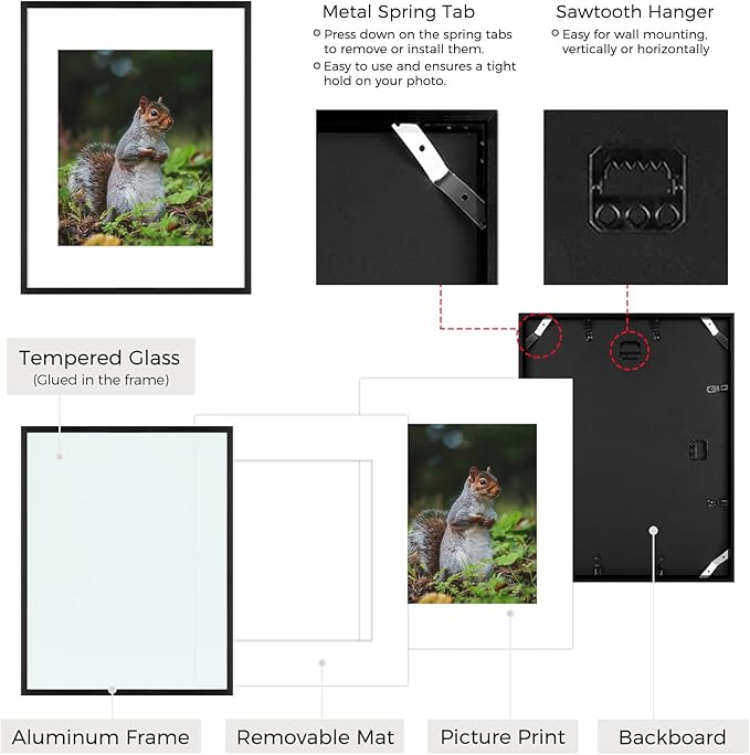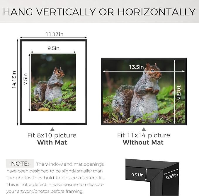- Can Display:Each 11x14 frame includes a removable Mat (opening size: 7.5"x9.5"), fits for 8 x 10 picture print (with Mat) or 11 x 14 poster (without Mat)