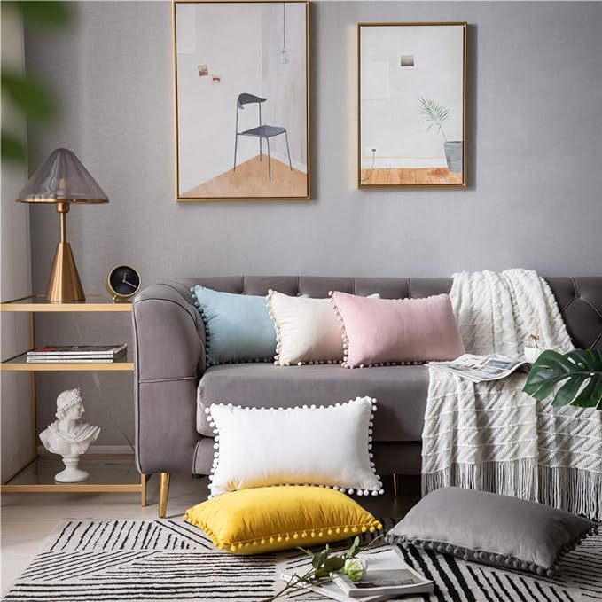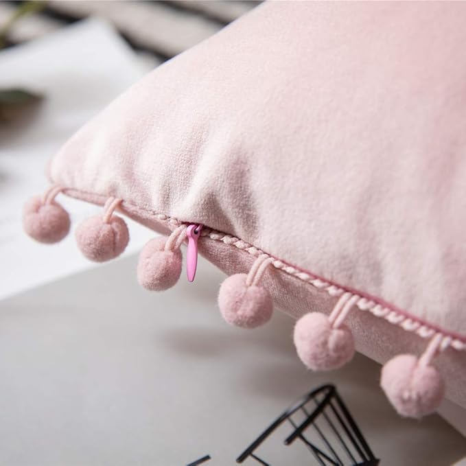 DEZENE 12x20 Throw Pillow Covers Pink: 2 Pack Cozy Soft Pom-poms Velvet Rectangular Decorative Pillow Cases for Farmhouse Home Decor
