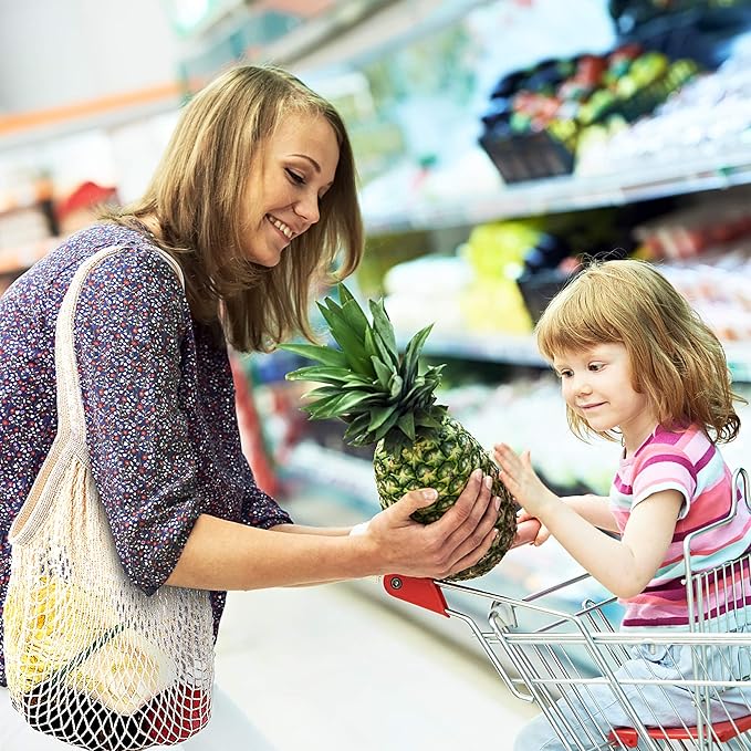 5 pack Cotton String Shopping Bags Reusable Washable Grocery Mesh Bags Organizer for Grocery Shopping Produce Net Bags with Longhandle for Fruit Vegetable Storage