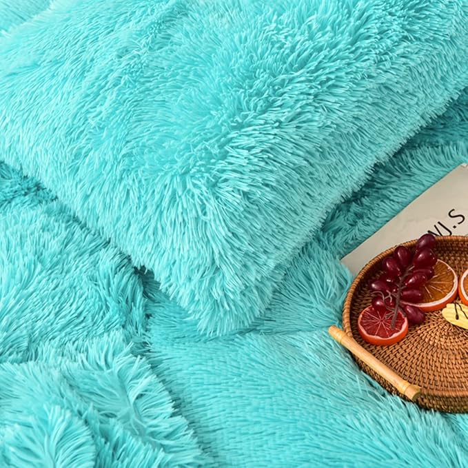 MorroMorn 5 PCS Shaggy Duvet Cover Bedding Set - Long Faux Fur Luxury Ultra Soft (Aqua, Full/Queen)