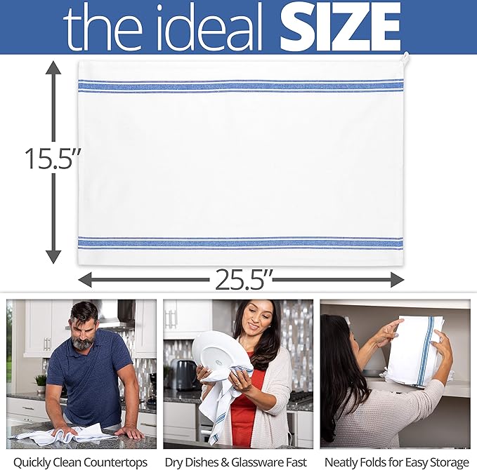 - ✅ THE IDEAL SIZE - Our kitchen dish towels have a finished size of 25.5 x 15.5 inches—a total of nearly 400 square inches of thirsty cotton in every towel for super-absorbent functionality.