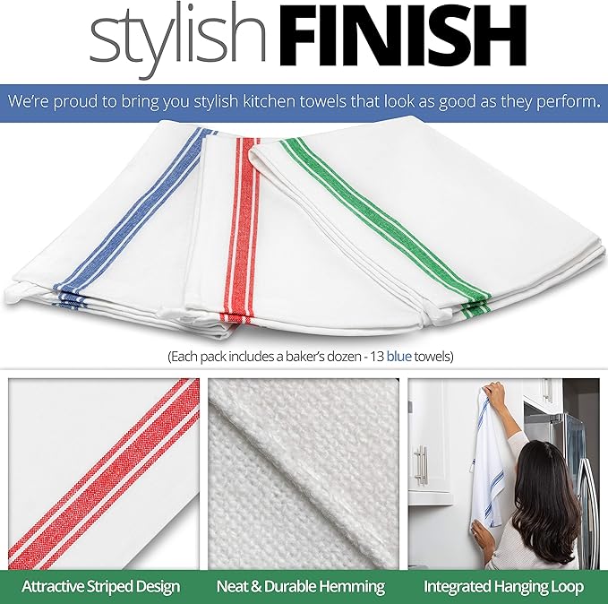 - ✅ STYLISH FINISH - This 13-piece set includes red, blue, and green vintage striped towels for accenting any kitchen design. The cotton dishtowels are hemmed on all 4 sides and feature a hanging loop.