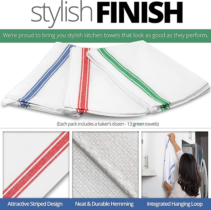 - ✅ STYLISH FINISH - This 13-piece set includes red, blue, and green vintage striped towels for accenting any kitchen design. The cotton dishtowels are hemmed on all 4 sides and feature a hanging loop.
