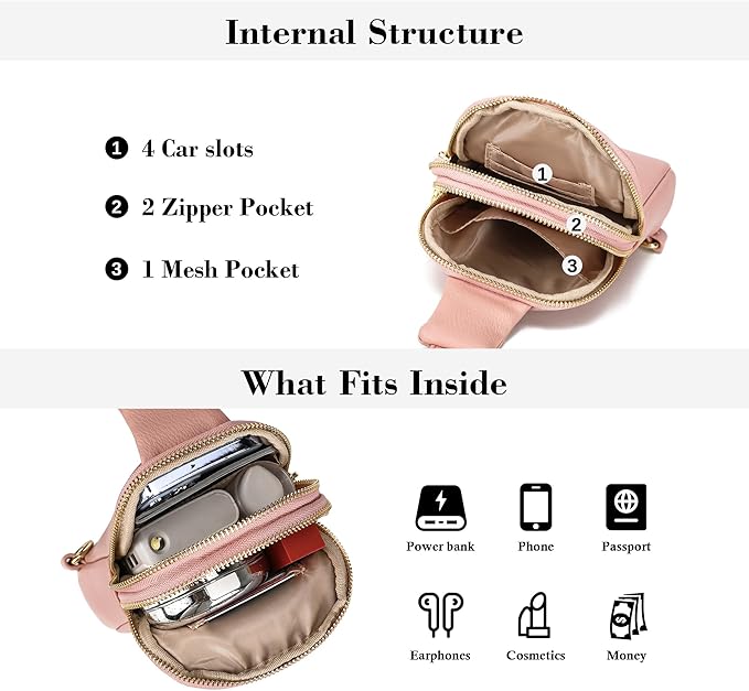 - 【1L Capacity for Essenticals】Chest bag for women has two zip pockets, inside has CARD SLOTS design. Meaning you can store credit cards,keys, cash and other small items in the front pocket. As a travel purse, it has multiple passport holders.What's more, this cute fanny packs for women allows you can put the 6.9 inch cell phone in a big pocket to prevent it from dropping and easy to answer your phone when outdoor activity.