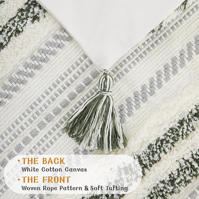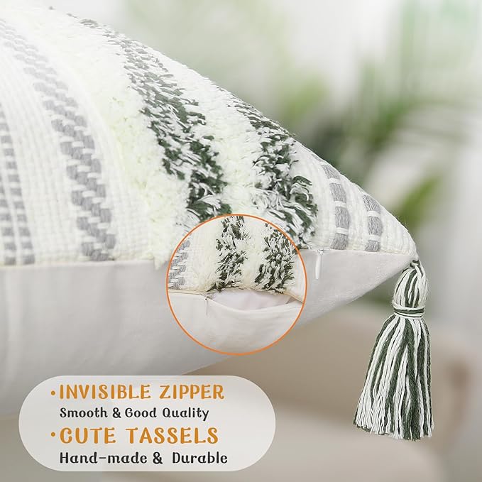 decorUhome Decorative Boho Throw Pillow Cover 12x20, Lumbar Accent Neutral Textured Tufted Pillow Cover Striped for Couch Bed Sofa, Green and Cream White, Pack of 1