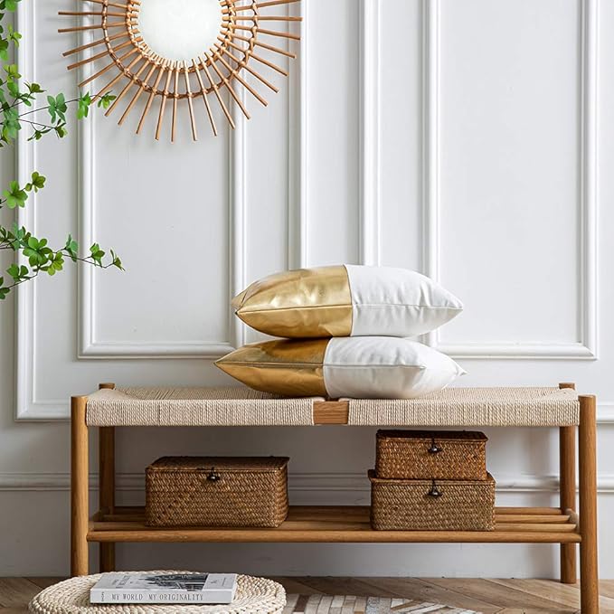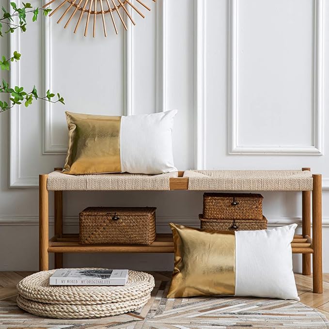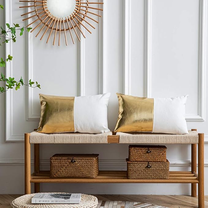 DEZENE Leather Throw Pillow Covers, Set of 2 Modern Leather/Cotton Decorative Pillowcases for Home Decor Bedroom Living Room Couch Bed Sofa, 12x20 Inch, Gold and White