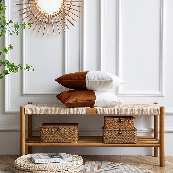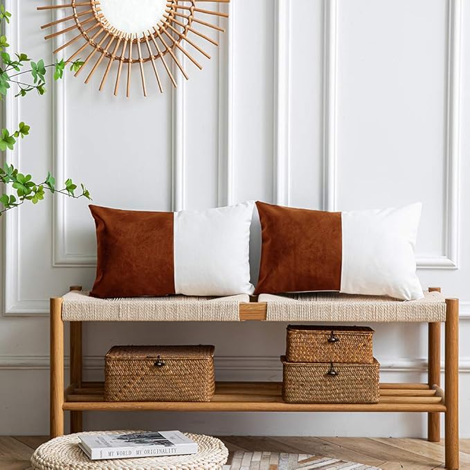 DEZENE Leather Throw Pillow Covers, Set of 2 Modern Leather/Cotton Decorative Pillowcases for Home Decor Bedroom Living Room Couch Bed Sofa, 12x20 Inch, Cognac-Brown and White