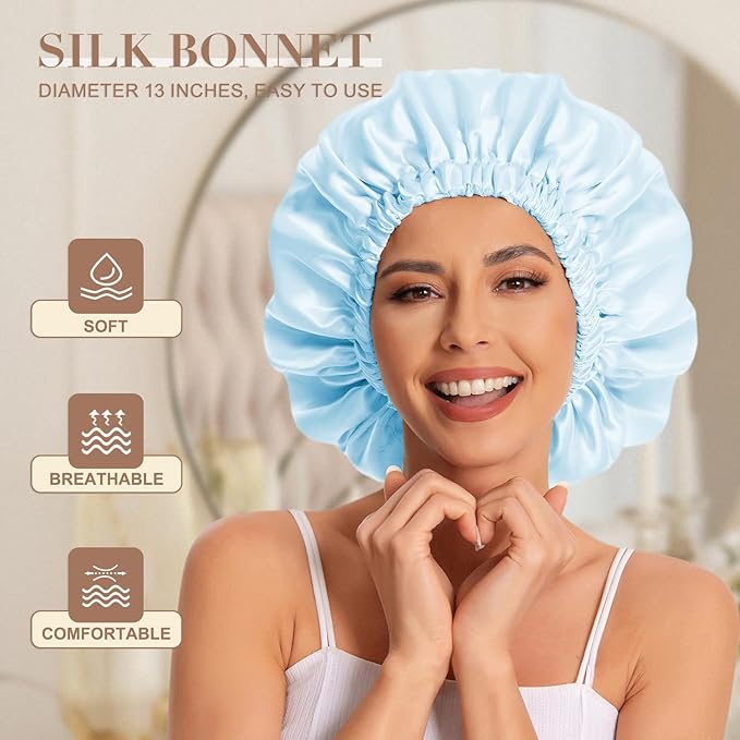 - 【Appropriate Size】The diameter of this silk bonnet is 13 inches and features a soft elastic band, making it suitable for almost all head sizes. Satin sleep beanie are suitable for curly hair, natural hair, long hair, braids, weaves, rollers, hair clamps, and up-dos.