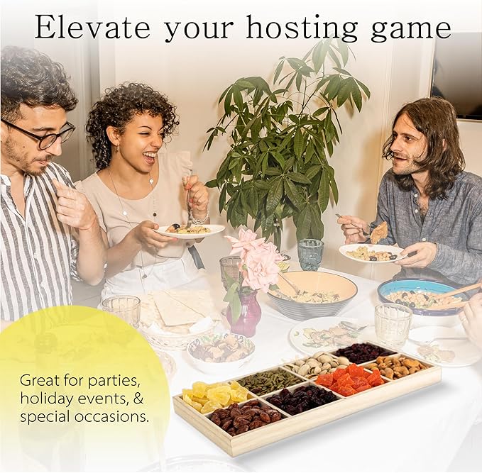 - MULTI PURPOSE TRAY: Our quality made, original sectioned wood grain serving trays are the perfect choice as a chip and dip platter, a divided serving tray for appetizers and snacks or a veggie platter. Fill the tray with dried fruits, nuts, chocolates and sweets and experience an instant upgrade to whatever you may be serving.