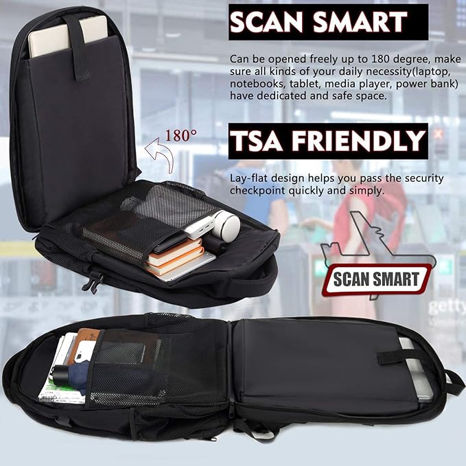 - ✈TSA BACKPACK FOR TRAVEL & MULTIPURPOSE - Checkpoint fast approved feature design, makes it pass quickly and easily by unfolding the laptop flat freely 90°-180°without removing your laptop. The large backpack is perfect for indoor/outdoor activities.Served as a large laptop bag ,large college backpack for men, large business backpack .Mens backpack can use as daily /college/ work /occasional international Travel / Weekend short trip getaways / Airplane travel / Hiking Camping / overnight.