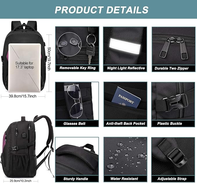 - ✈DIMENSION AND DURABLE MATERIAL- Size of extra large backpack: 19.7’x15.7’x10.2’,perfect to throw under your seat on an airplane when you are traveling or on business trip.Capacity:50L, separate padded laptop compartment hold for 13 ,14, 15,15.6 and up to 17inch Laptop/computers for men, adults, women, men. The scan smart laptop backpack made from high quality polyester fabric shockproof with high density nylon lining for better TEAR and WATER RESISTANT and heavy duty backpack.