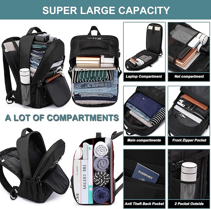- ✈LARGE CAPACITY AND MANY POCKET - Travel laptop backpack for men owns 20 independent pockets.One separated padded laptop compartment.Three net compartment fit your laptop accessories.3 spacious main multi compartments with many hidden pockets can accommodate lots of stuff like file folder, lunch, clothes and college supplies, travel accessories and other daily necessities;Mesh pockets at side for water bottle and compact umbrella.Front compartment for easy access essentials.