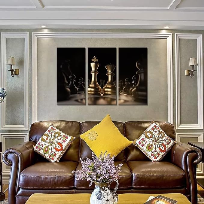 Chess Wall Art Black and Gold Canvas Wall Decor King and Queen Paintings for Living Room Office 3 Pieces Pictures Prints Poster Artworks Framed Ready to Hang(14x 28inch/3 PCS)