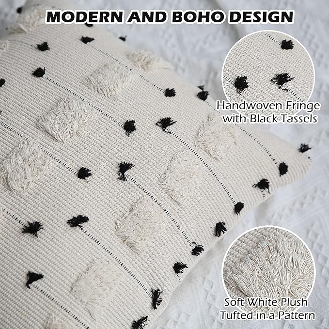 - MODERN DESIGN: Fringed with black tassels, the handwoven pillow covers combine soft white plush tufted in a pattern that looks like an artwork. The simplistic, neutral design add charm and interest to any room whether your look is a casual cottage, rustic farmhouse, or a transitional blend.