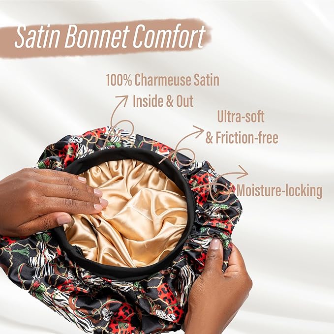 - Protects Hair from Breakage & Frizz: Smooth satin in our hair bonnet reduces friction and locks in moisture, preventing damage. Ideal satin bonnet for sleeping, silk bonnet for curly hair, and bonnets for women sleeping with curls, braids, or locs.