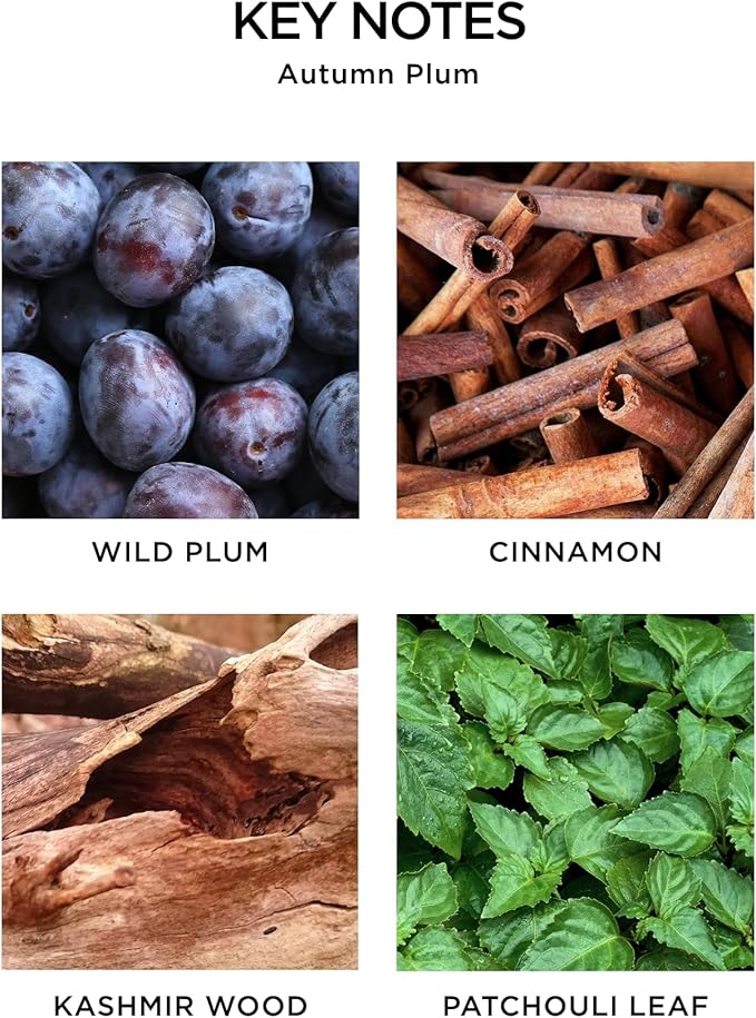 - WARM & SPICY - Autumn Plum features an autumnal blend of wild plum, cinnamon, patchouli leaf, and cashmere wood.