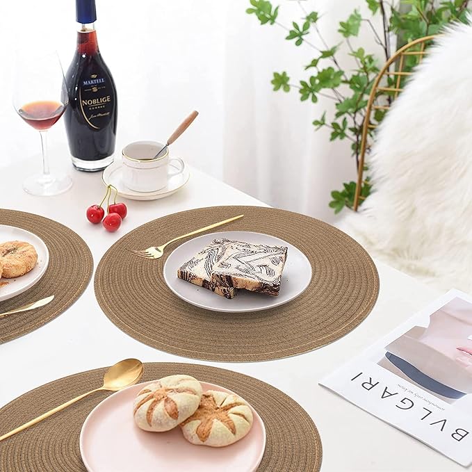 SHACOS Round Braided Placemats Set of 6 Washable Cotton Polyester 15 inch Round Table Place Mat for Dining Table (Brown, 6)