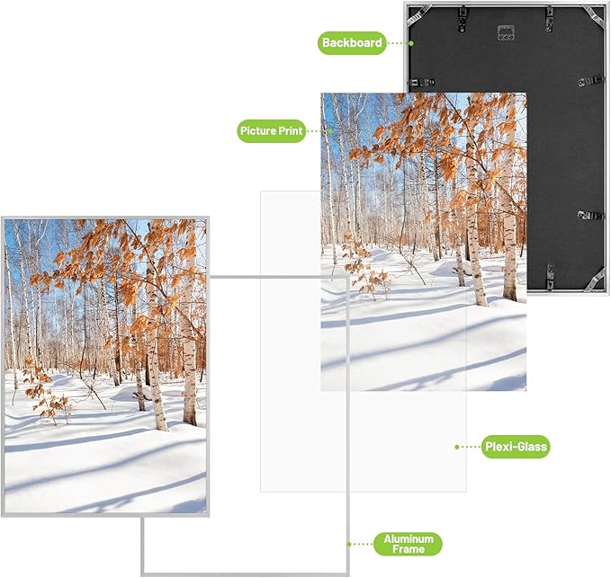 - Material: Brush Silver Aluminum Finish Frame with Plexiglass Front, That Gives a Clear View of Your Pictures, Preserve Your Artwork For a Long Time