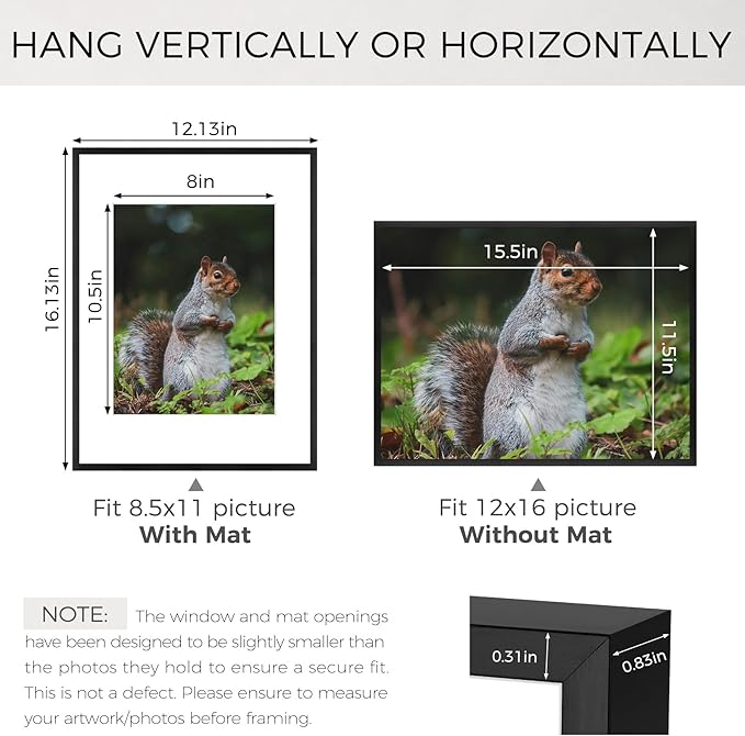 - Can Display:Each 12x16 frame includes a removable Mat (opening size: 8"x10.5"), fits for 8.5 x 11 picture print (with Mat) or 12 x 16 poster (without Mat)