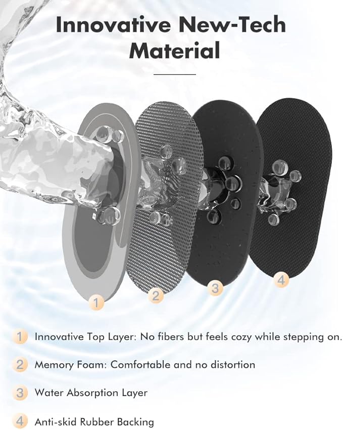 - Super Absorbent & Stain Resistant: Innovative advanced nano porous PU leather surface can absorb dripping water instantly without leaving any watermarks or stains. Super absorbent bath mat in front of bathtub, shower door or sink to keep bathroom floor clean, dry and safe.