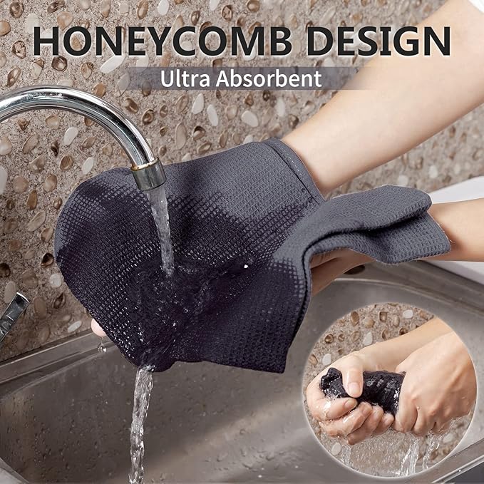 - Absorbent & Quick Drying Dish Towels for Kitchen - Hollow honeycomb weave design makes the kitchen dish cloths lightweight, breathable, super absorbent and dry quickly. These waffle kitchen towels is perfect to tackle all of your dryings, wiping and cleaning kitchen tasks without leaving streaks, low lint and scratch-free.