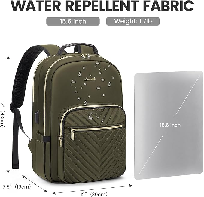 - 💯【Upgraded Laptop Backpack Women】: Classic V-shaped embroidery thread. Upgraded double LOVEVOOK no-slip metal zippers,water resistant Nylon fabric with polyester lining, ensures long lasting usage. Total of 4 compartments and 16 pockets for your computer,A4 folder,bottles,umbrellas,clothes,work supplies,college supplies and travel essentials.Dimensions: 12"L 17"H 7.5"D, Weight: 1.7lbs.