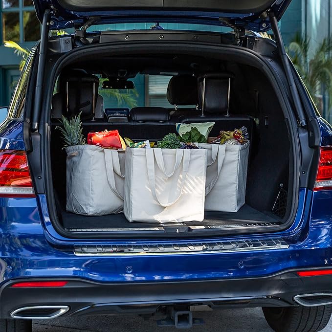 - WHAT DOES 80LBS OF GROCERIES LOOK LIKE? You’re about to find out! Because these heavy duty reusable grocery bags are made from 12oz canvas, double stitched, overlocked and cross stitched on the handles! And so each one of these organized shopping bags holds 80lbs! Load them up with as much as you want.
