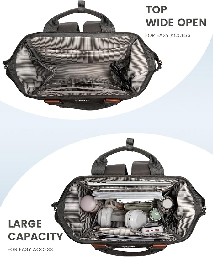 - This womens laptop backpack has a double zipper closure and the handles also have a snap button for added security. The wide opening it has at the top. The top opens up wide & stays open. The zipper glides smoothly. With a hidden anti theft pocket on the back protect your valuable items from thieves.