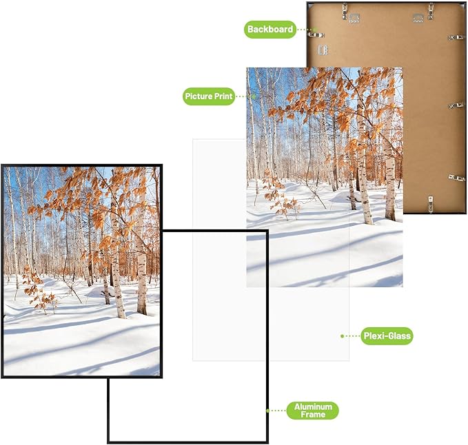 - Material: Brush Black Aluminum Finish Frame with Plexiglass Front, That Gives a Clear View of Your Pictures, Preserve Your Artwork For a Long Time