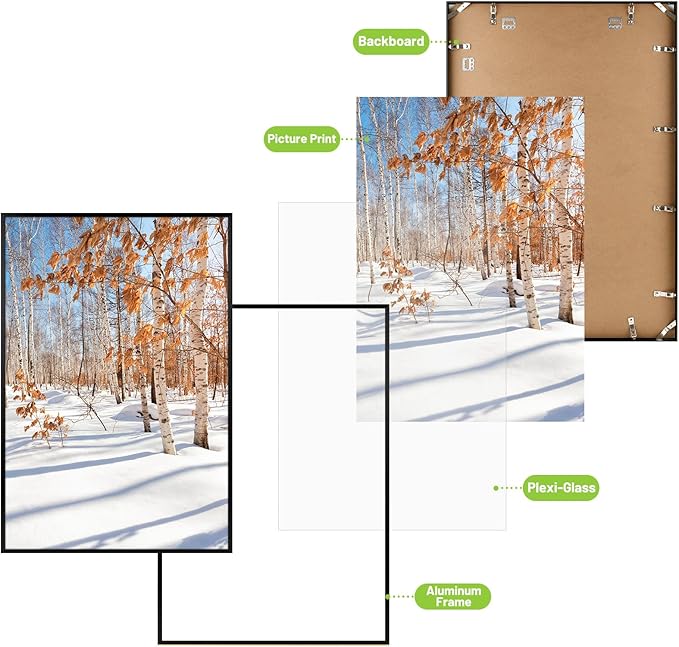 - Material: Brush Black Aluminum Finish Frame with Plexiglass Front, That Gives a Clear View of Your Pictures, Preserve Your Artwork For a Long Time