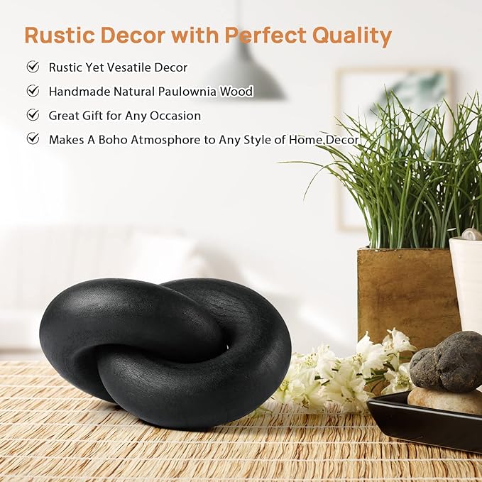 Wood Chain Decor, 2-Link Decorative Chain Hand Carved Boho Wood Knot Decor for Bookshelf Desk Living Room Coffee Table Farmhouse Ornament (Black)