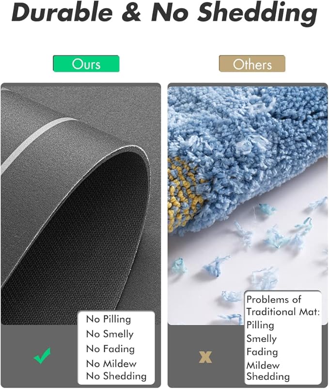 - Easy Clean&Durable: Durable and easy clean than bath stone mat. No stains comparing to normal soft diatomaceous earth bath mat. No pilling, fading, shedding comparing to traditional microfiber bath rug Smooth surface designed to resist dirt and hair, friendly for family with pets. Simple wiping or rinsing can make your bath matt as well as new.