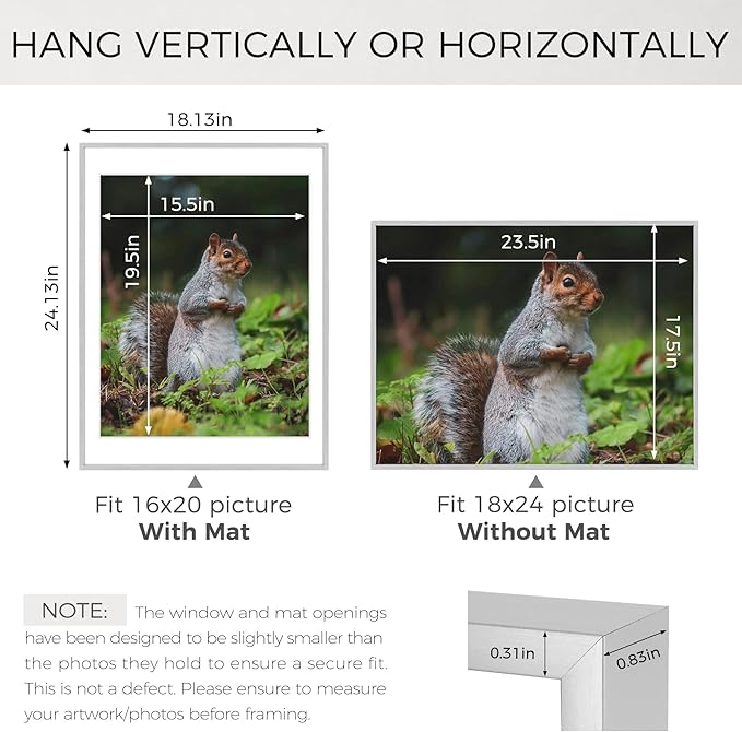 - Can Display:Each 18x24 frame includes a removable Mat (opening size: 15.5"x19.5), fits for 16 x 20 picture print (with Mat) or 18 x 24 poster (without Mat)