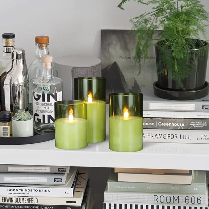 GenSwin Green Glass Battery Operated Flameless Led Candles with 10-Key Remote and Timer, Real Wax Candles Warm White Flickering Light for Home Decoration(Set of 3)
