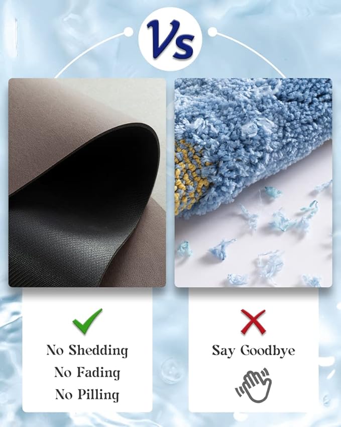 - DURABLE:These bathroom mats are designed with a Faux suede surface. You will never be bothered by fiber dropping or fuzzy pilling problems like traditional chenille bathroom floor mats. Therefore, this bath rug is much more durable without problems caused by fibers, like shedding, fading, wearing, dirt or hair hiding