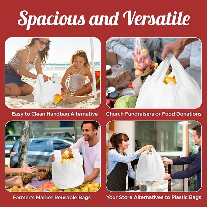 - ✅ WASHABLE, REUSABLE, AND CONVENIENT: After using these bags for a few shopping trips, simply throw them into the washer-dryer and use them all over again. With 450 different reusable t-shirt bags included in this pack, wash, reuse, pack, and unpack, as much as you want.