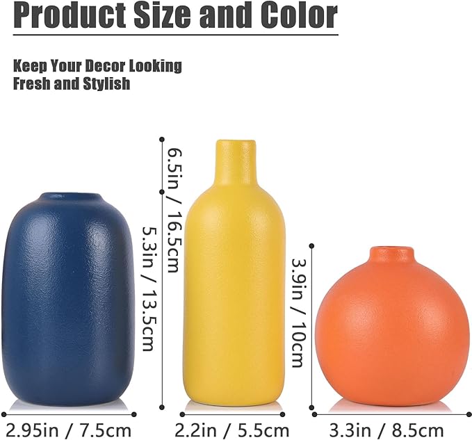 - Multicolor Ceramic Vase: Our ceramic vase 3-piece set is a combination of 3 vases of different shapes and colors. The bold combination of orange, yellow and blue together in bright colors is suitable for matching any warm color scene, perfect for all decorating styles in homes, offices, stores, restaurants and cafes