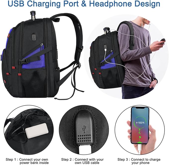 - 【USB Port & Headphone Design】: This 17Inch laptop backpack offers you a more convenient way to charge your phone. External USB port with set-in charging cable offers convenient charging your cellphone and other electronic devices everywhere. (Tips: power bank is not included) A hole for headphone outside gives easy access to Earphone usage. As a bookbag for school/backpack for men/backpack for women/travel backpack/carry on backpack, you will enjoy It's fashionable and convenient everywhere