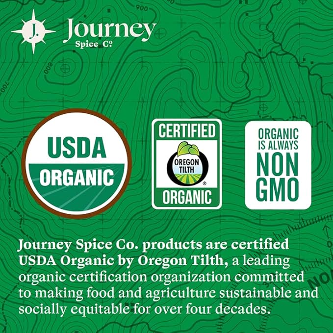 - USDA ORGANIC SPICES AND SEASONINGS: All Journey Spice Co. products are USDA Organic Certified, non-GMO, MSG-free, gluten-free, contain no artificial preservatives, colors, or flavors, are non-irradiated and EtO-free, are synthetic chemical-free, contain no fillers or anti-caking agents, and are vegan-friendly. Additionally, our seasonings are free of major allergens such as soy, nuts, peanuts, fish, wheat, and eggs. Please refer to individual product ingredient information if you have a sesame allergy.