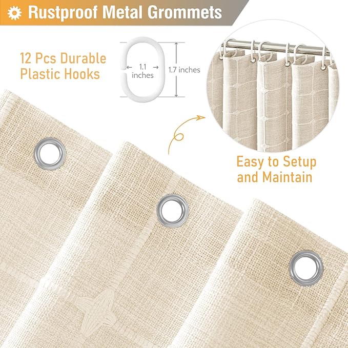 - 🛁【Dimensions】: W72xH72 inches(The tassel length is not included); ❤️The tassel brings 1.4 inches of additional length❤️; Package includes 1 cream shower curtain and ★12 Plastic Hooks★; Various sizes shower curtains meet most bathtubs and shower stalls need. This farmhouse shower curtain is perfect for apartment, hotel, spa, camper, RV, dorm, school shower, athletic club, gym and everywhere else you need a shower curtain.