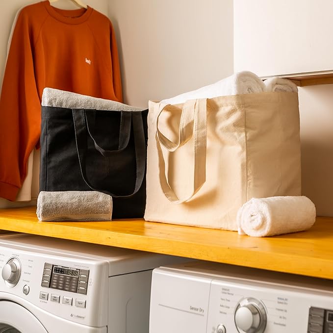 - 100% NATURAL COTTON GROCERY BAGS: Black canvas shopping bag with no ugly logos and no chemical treatment. They are machine washable grocery bags and while they will wrinkle a little, it’s nothing like how the others shrink! So Don’t freak out, it’s normal. Flatten while wet, or iron once dry.