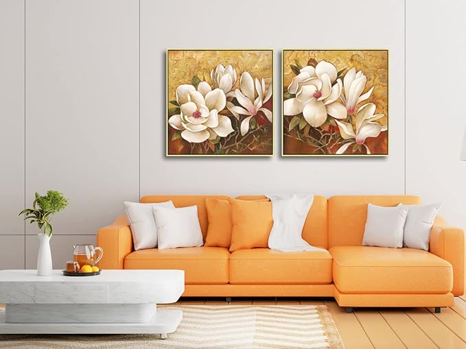 Pyradecor Large Gold Framed Canvas Wall Art Magnolia Flowers 2 Panels Floral Canvas Prints Brown Pictures for Living Room Bedroom Home Decorations