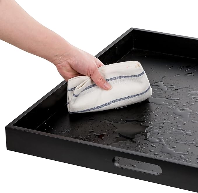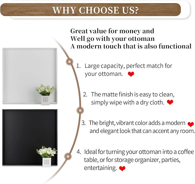 - MODERN & EASY CLEAN - The matte white / black finish gives it an elegant and simple look with a modern appeal that can be used to display decorative items, they fit well with most home decor styles and tastes, and are very easy to clean, just wipe with a dry cloth and your new tray for ottoman coffee table will change the way you think about presentation and serving guests!