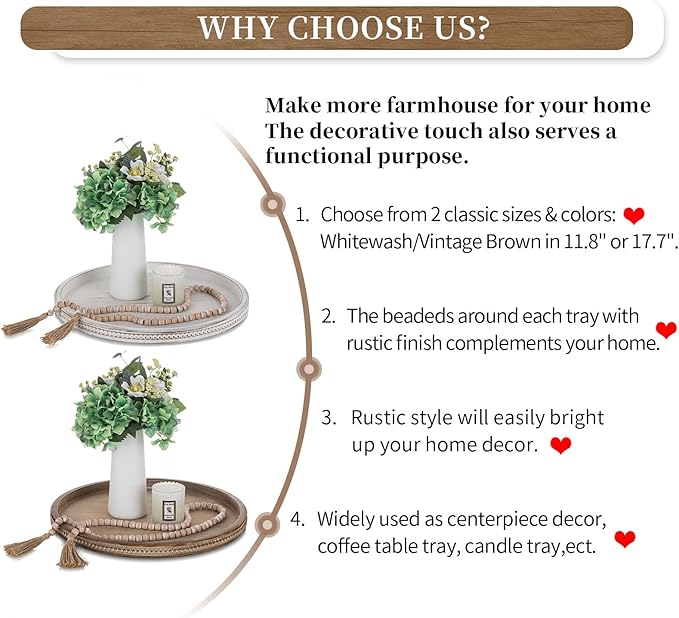 - PRACTICAL & BEAUTIFUL - The trays for coffee tables are a great nice accent piece. The edge of the coffee table tray is designed with beaded style, and they are in white washed color, making them natural and simple. The plastic beads and wood tray blend together will give you a shabby chic feeling, which can show your nice taste to others.