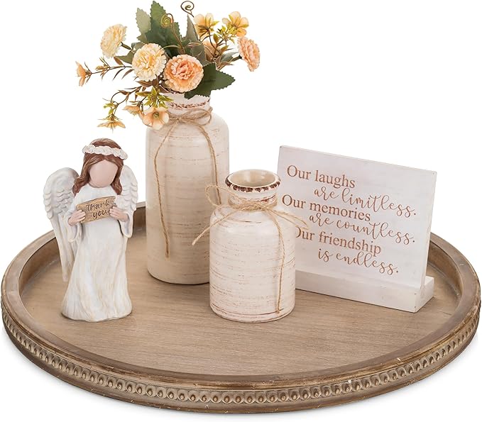 Hanobe Large Round Decorative Tray: Coffee Table Beaded Trays Rustic Wood Trays Decor Farmhouse Ottoman Circle Vintage Centerpiece Wooden Serving for Living Room Home for Counter, Brown