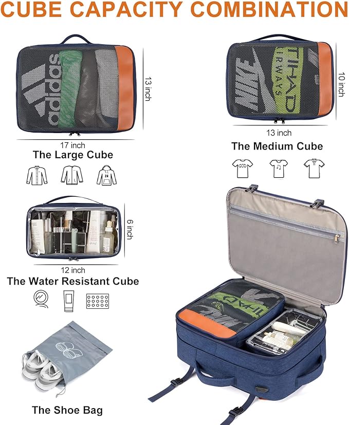 - EXTRA 4 PACKING CUBES:This weekend travel backpack comes with four packing cubes. large cube for sweaters, jackets, pants. Medium cube for shirts, shorts. Small water resistant cube with transparent side for providing clear overview of toiletries. there's also a shoe pocket. Keeping your belongings neater and more organized. Serve you well as carry on bags for airplanes, weekender backpack, personal item travel bag, overnight bag.