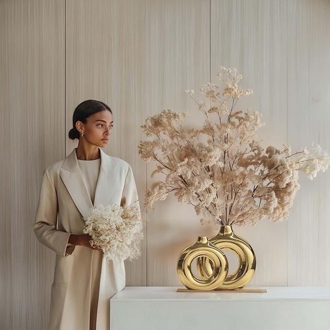 Glossy Gold Ceramic Vase Set of 2,Round Donut Hollow Flower Vases for Home Decor Accents,Modern Minimalist Centerpiece Table Decorations,Wedding,Living Room,Bookshelf,Office,Entryway